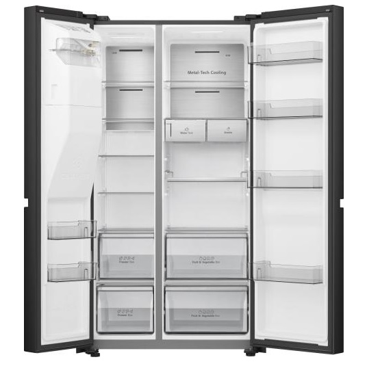 Ta hladilnik Hisense vam z ikoničnim dizajnom ob strani, značilnim za ameriške hladilnike, omogoča, da to sodobno zasnovo pripeljete v svojo kuhinjo.
